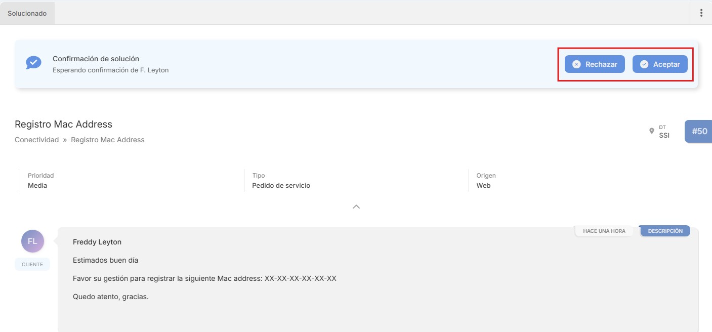 Una vez que usted acepte la solución, el requerimiento pasará a estado “Cerrado”.