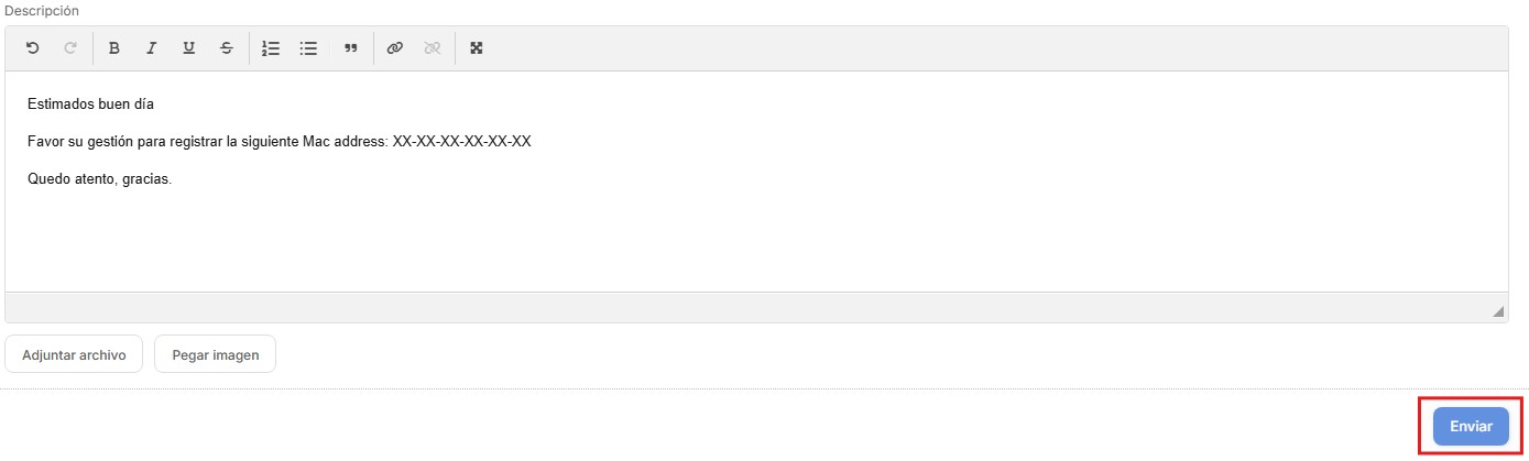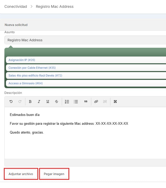 6. Procedemos a completar la “Descripción”. Igualmente, si lo desea podrá adjuntar algún archivo o pegar una imagen que pueda ser útil para la gestión de su requerimiento.