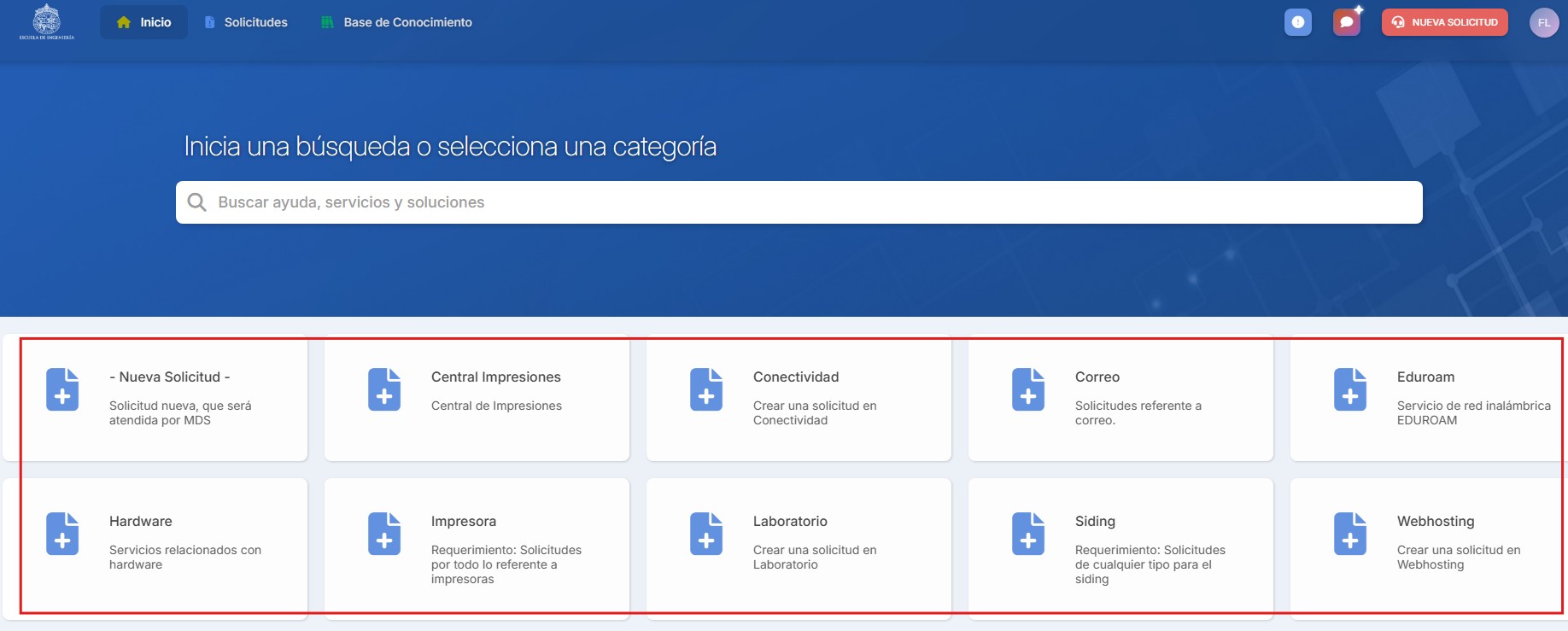 Debe escoger una categoría asociada a su tipo de requerimiento, incidente, problema o consulta que presente. En la interfaz principal, usted podrá visualizar las categorías mas frecuentes utilizadas por los usuarios:
