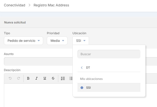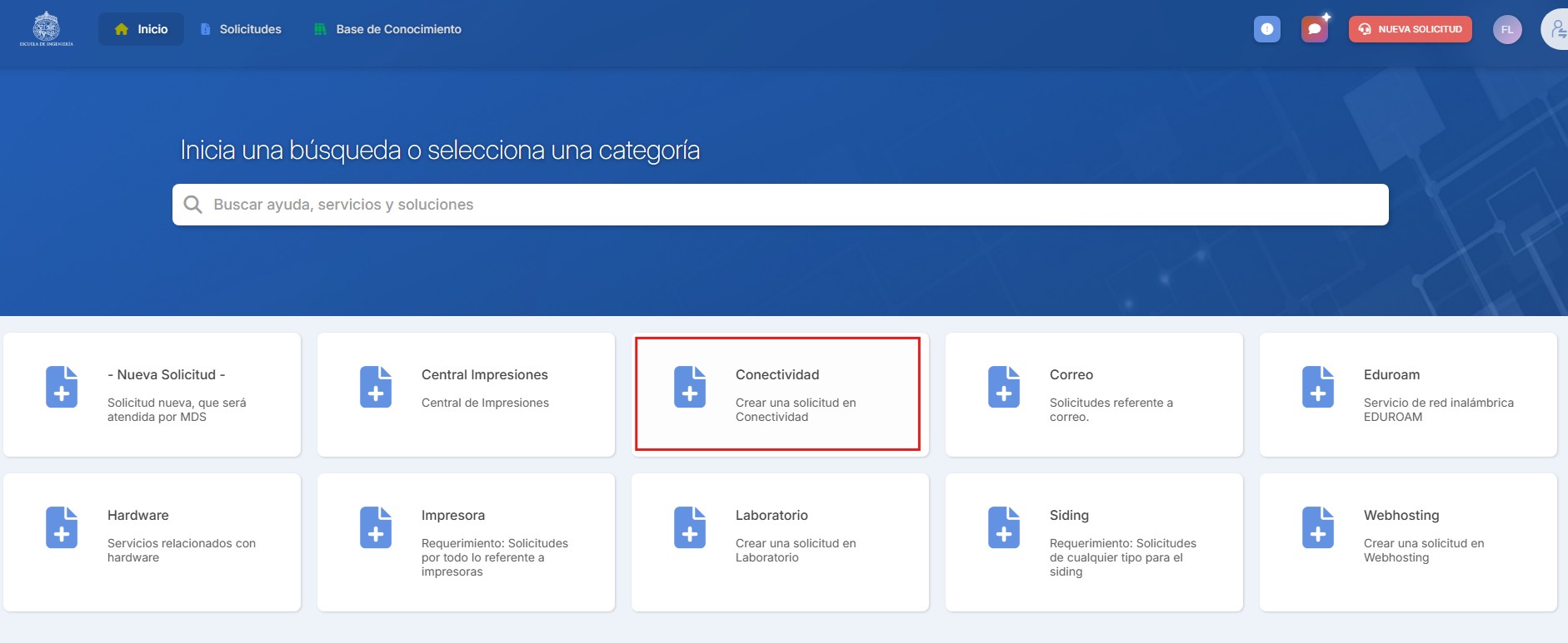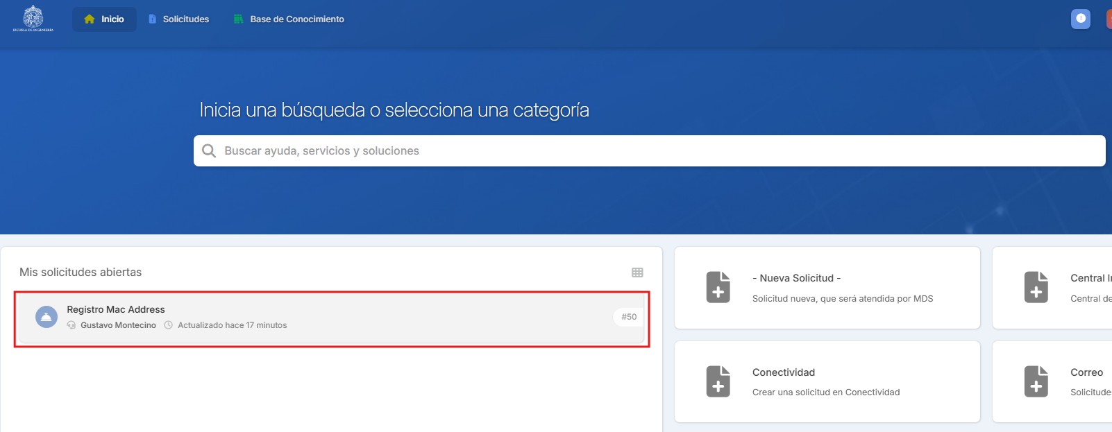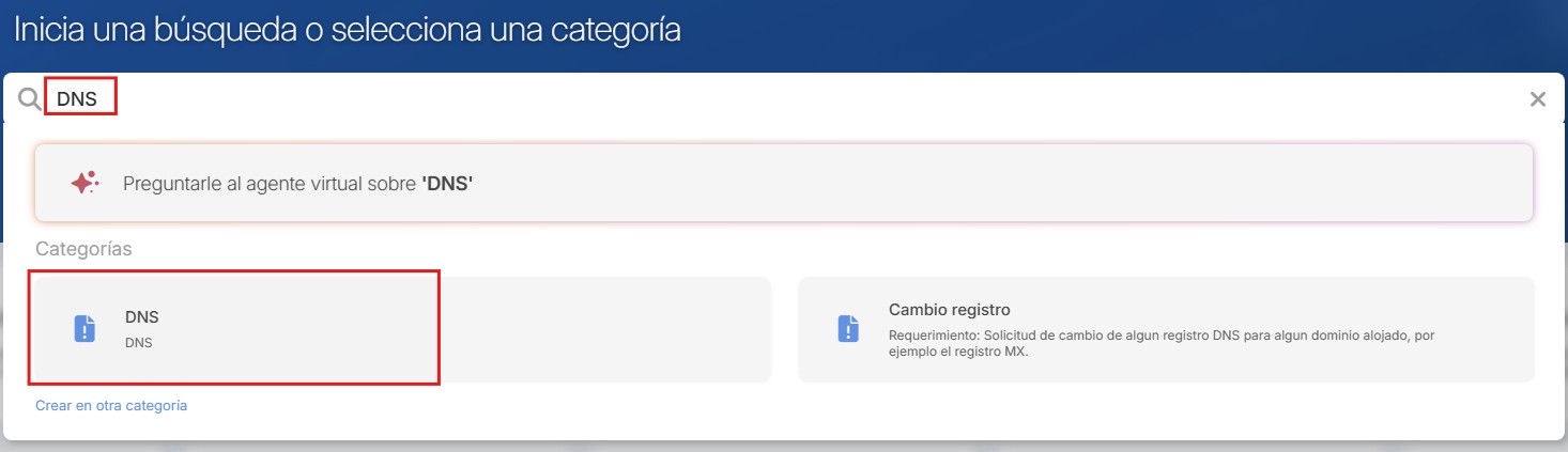 En caso de que no aparezca una categoría asociada a su requerimiento en la pantalla principal, puede encontrarla en la barra de búsqueda (por ejemplo DNS). Solo en el caso que no exista una categoría asociada, sugerimos crear su requerimiento como -Nueva Solicitud-