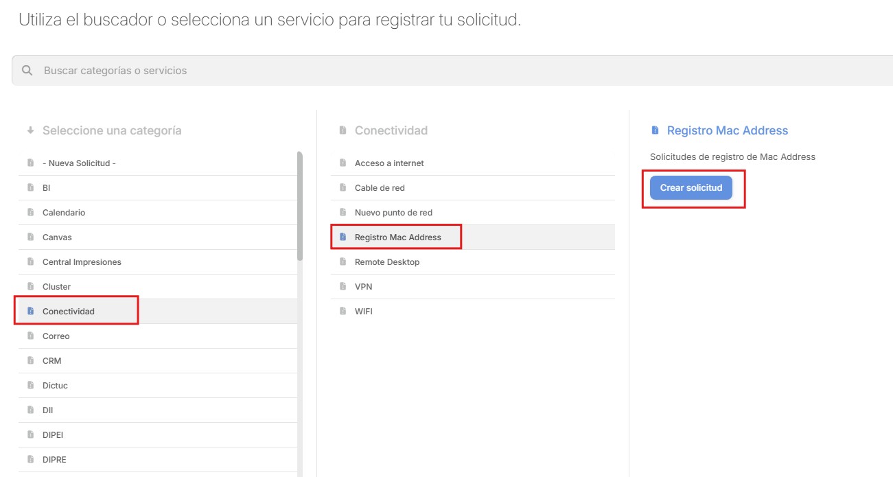 Luego de escoger la categoría, se debe escoger una subcategoría o tema asociado a su requerimiento. En este ejemplo, se requiere registrar una Mac address de un equipo, para que obtenga conexión a la red cableada. Por lo tanto, hacemos click en “Registro Mac address” y luego en “Crear solicitud”.
