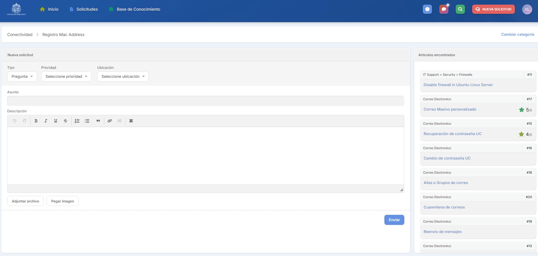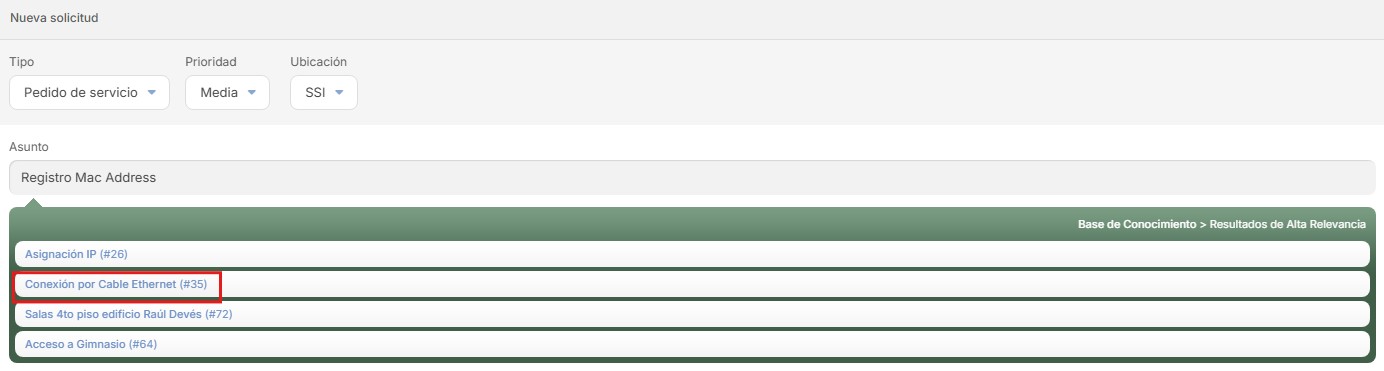 4. Luego, debe completar el contenido del requerimiento, con el “Asunto” y la “Descripción”. Al momento de escribir el asunto, la IA (inteligencia artificial) de la plataforma Invgate le va a sugerir algunos artículos de información que podrían ser de utilidad, incluso para resolver su requerimiento antes de enviar la solicitud. En este requerimiento, un artículo que podría ser útil es “Conexión por Cable Ethernet”: