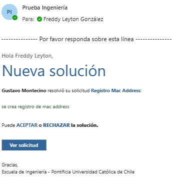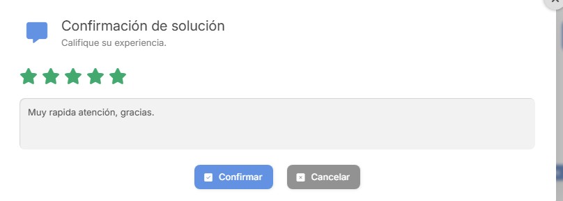 El requerimiento ya se encuentra en curso y está siendo gestionado por algún agente de la Mesa o Administrador a cargo. Luego de la gestión y una vez solucionado su requerimiento, usted recibirá un correo con la notificación, donde se le solicitará su Aprobación o Rechazo a la solución entregada, además de una pequeña encuesta de satisfacción: