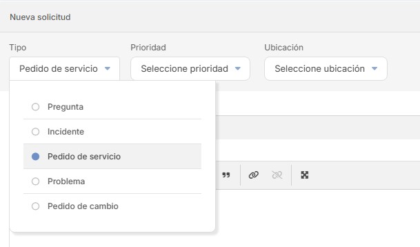 - Seleccionar “Tipo” de solicitud: En este caso, corresponderá a un Pedido de Servicio.