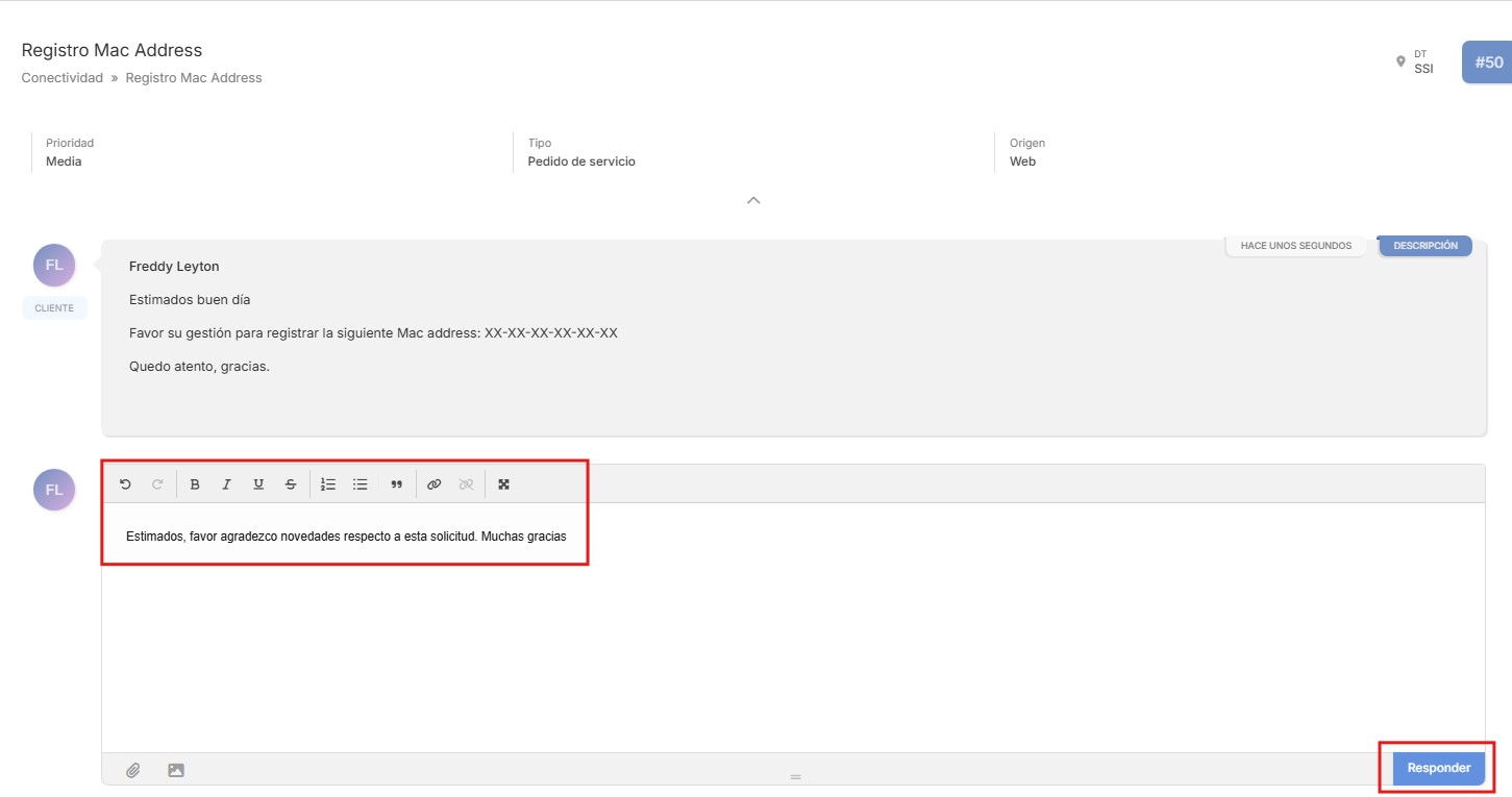 8. Luego de presionar en “Enviar”, podrá ver su requerimiento en el Portal de usuarios ya creado. Se puede ver igualmente, que existe un espacio para agregar comentarios en el ticket o requerimiento de forma directa, lo que permitirá darle seguimiento a su solicitud .