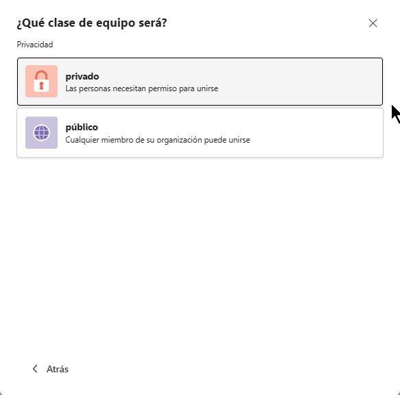 Decida si el equipo será privado (solo accesible para miembros invitados) o público (abierto a todos en la organización).