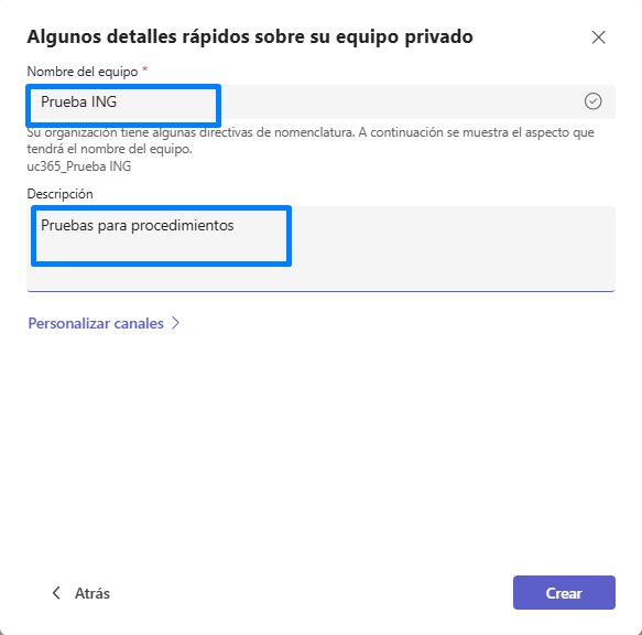 Asigne un nombre al equipo y añada una descripción opcional, luego presione Crear