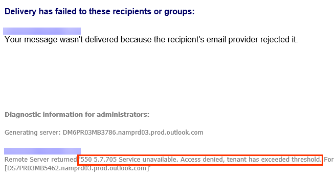 Ahora bien, ¿cómo detectar que mi casilla de correo ha sido bloqueada?, por lo general, la Mesa de Servicios de la Universidad o la Mesa de Ayuda de la Escuela se comunica con los miembros de la Comunidad cuyos correos están bloqueados, pero la forma más sencilla de saberlo, es que sus correos enviados están rebotando o siendo devueltos con un Error. Y obtendría un mensaje de Delivery has failed to these recipients or groups cómo en la siguiente imagen de ejemplo: