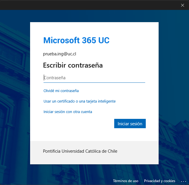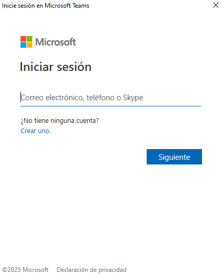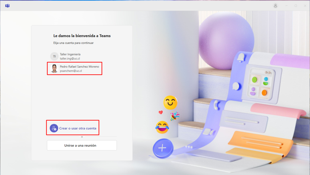 Microsoft Teams cargará por defecto las cuentas que tiene configuradas en su Sistema Operativo. Debe seleccionar de la lista si su cuenta corresponde o hacer clic en Crear o usar otra cuenta.
