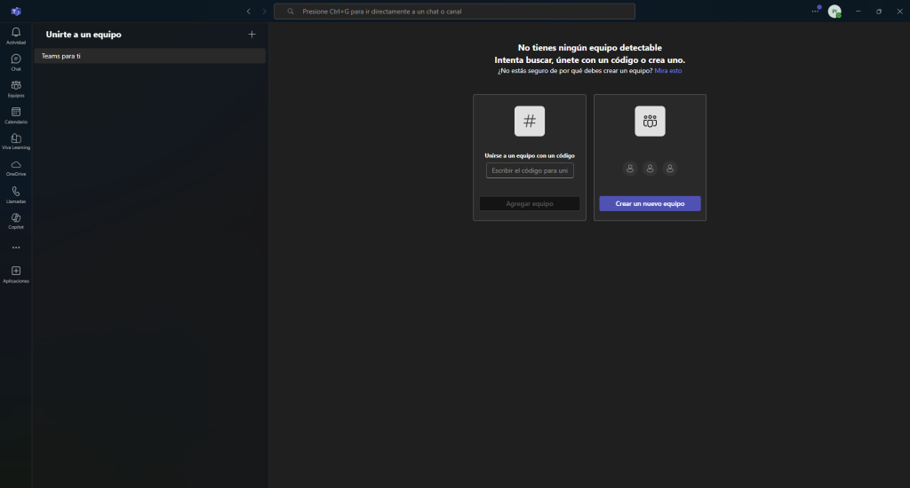 Finalmente, una vez validada sus credenciales, accederá a su espacio de trabajo de MS Teams.
