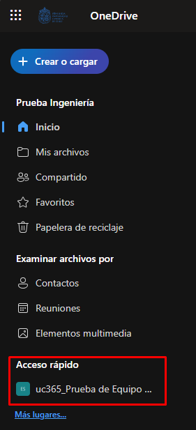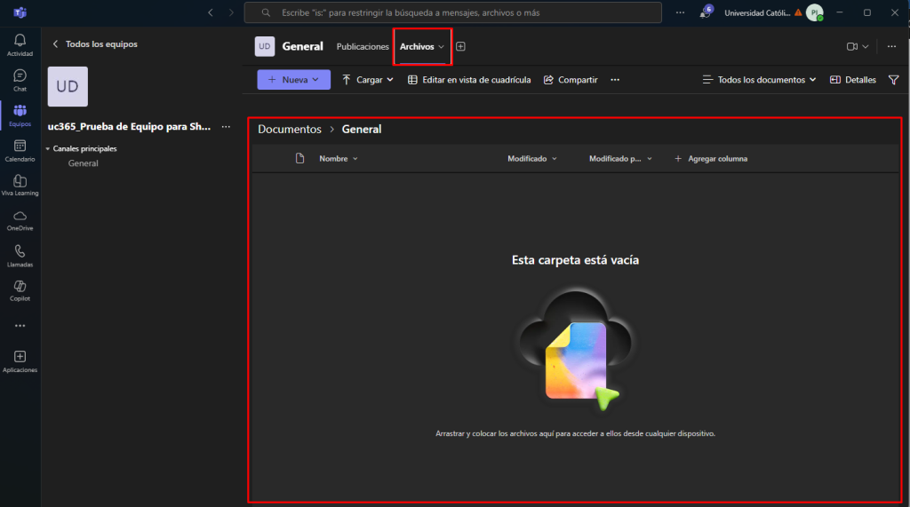 La Universidad tiene por política de seguridad bloqueada la creación directa de SharePoint por parte del usuario, por lo que, la forma más sencilla de realizarlo es vía creando un equipo de Microsoft 365. Para esta tarea le recomendamos que cree un equipo en MS Teams. Puede leer más de MS Teams en nuestros artículos dedicados a esta plataforma. Ejemplo, en este equipo en la pestaña Archivos tenemos acceso a la información de nuestro SharePoint.