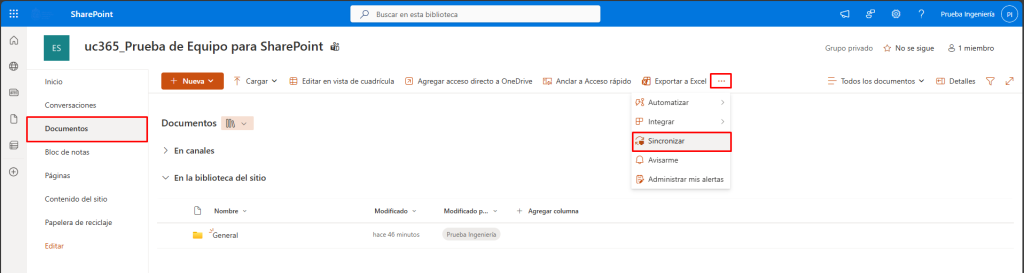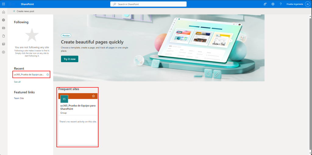 Y una vez dentro del SharePoint buscar la página que corresponde al nombre del Equipo con la información que nos interesa. En este ejemplo, es sencillo porque solo se tiene un equipo creado.