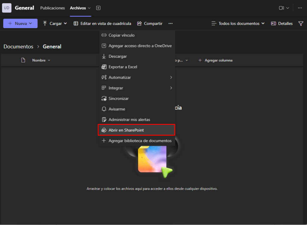 O sino debe hacer clic en los 3 puntos horizontales en la parte central y hacer clic en la opción Ir a Abrir en SharePoint.