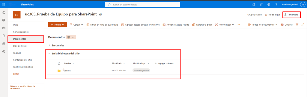 Deberá introducir sus credenciales de ser necesario y accederá luego a sus Documentos en su sitio SharePoint. Del lado izquierdo tendremos el menú del sitio, En la parte central nuestros archivos donde podremos cargarlos aquí directamente si quisieramos, también tenemos en la parte superior derecha si quisieramos agregar miembros para compartir, aunque esta última opción sería recomendable hacerla en el Equipo de MS Teams.
