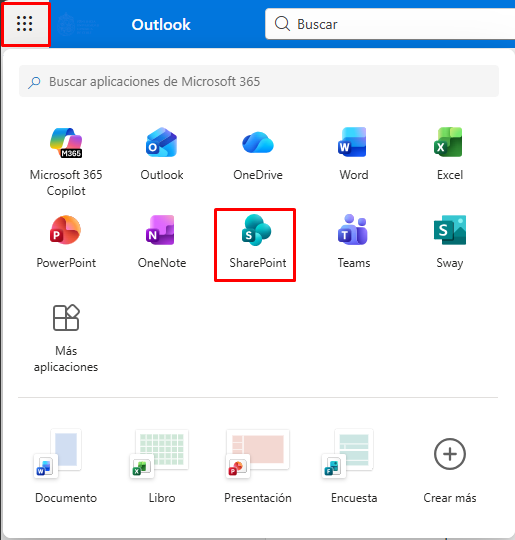 También puede buscar sus SharePoint abriendo una aplicación de Microsoft 365 en un navegador, por ejemplo, su correo Outlook y hacer clic en los 9 puntitos en la esquina superior izquierda donde se listan todas las aplicaciones cargadas en su licencia. En esta hacer clic en SharePoint o sino está listada hacer clic en Más Aplicaciones para que se listen todas.